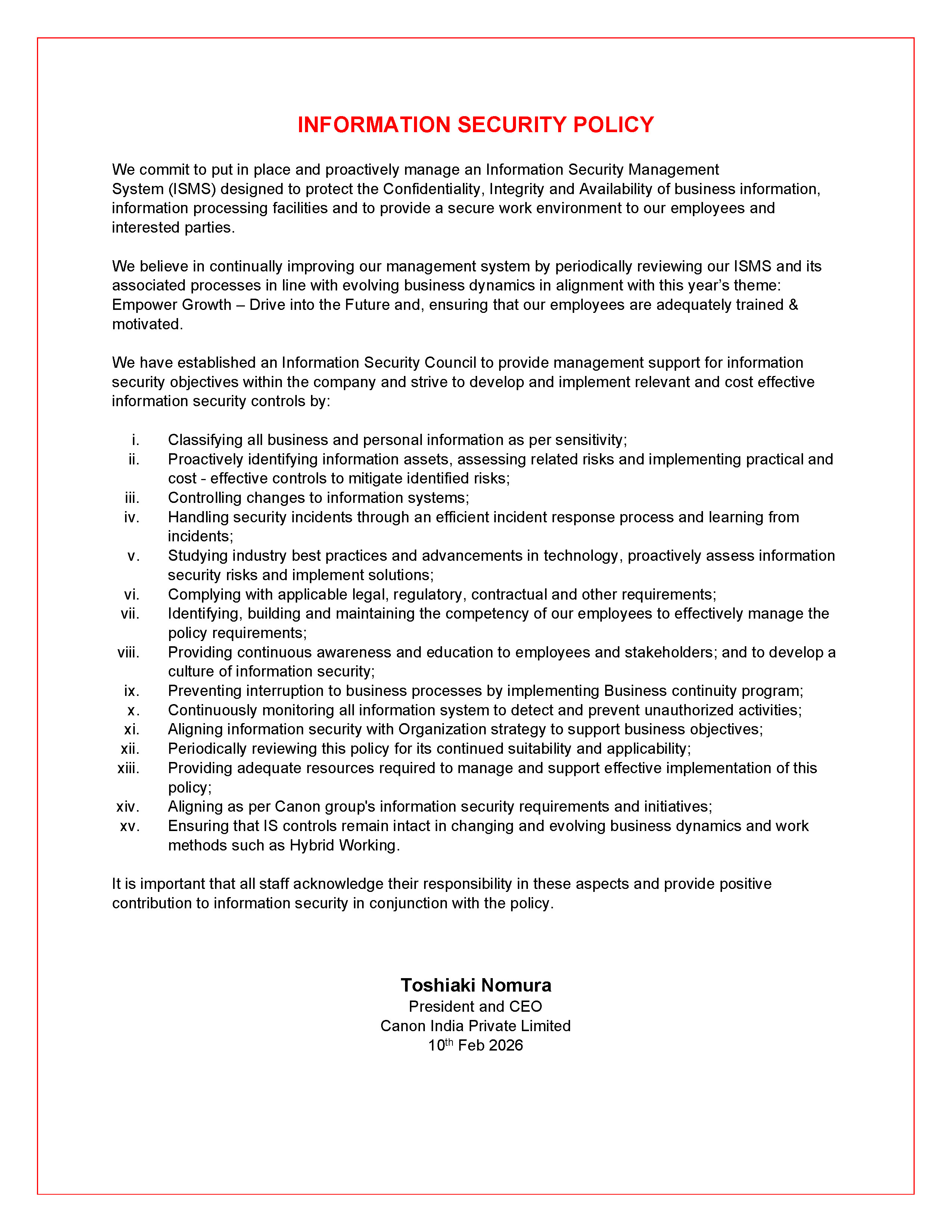 The Information Security Management System at CIPL applies for providing sales and servicing of its products in the field of digital imaging covering functions of Sales, Marketing, Market Engineering, Information Technology, Human Resources Operations, Human Resource Development Academy, General Affairs, Finance & Accounts, Legal & Regulatory, Logistics, QEHS, SIA and Corporate Planning from the Corporate Office, Branch Offices, Master Camera Repair Centres and NOIDA Warehouse.