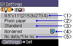 <5> Date/file no.: You can print the date the photo was taken / file numbers (DCF numbers) on photos.