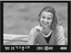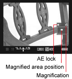 - If you take the picture while the image is magnified, the exposure might not come out as desired. Return to the normal view before taking the picture. During the magnified view, the shutter speed and aperture will be displayed in red. Even if you take the picture during magnified view, the captured image will show the normal view.
