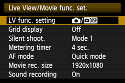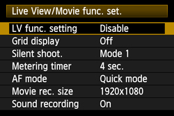 6. The [Live View/Movie func. set.] window appears, so turn the <Quick Control Dial> to select [LV func. setting], and then press the <SET> button. "LV" stands for Live View.