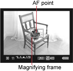 > button in the Live mode, the AF point area will be magnified. If it is difficult to focus in the magnified view, return to the normal view and autofocus. Note that the AF speed may differ between the normal and magnified views. - If you autofocus in the Live mode's normal view, and then magnify the image, the focus might be off.