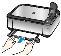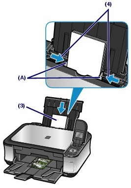 (3) Slide the Paper Guides (A) to open them, and load the paper in the center of the Rear Tray WITH THE PRINT SIDE FACING YOU.