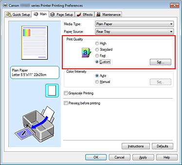 2. Select Custom for Print Quality on the Main tab, and click Set....