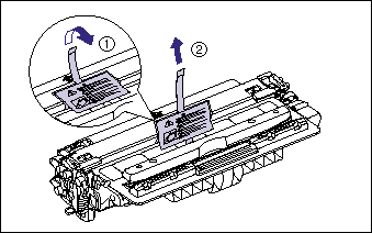 5. Pull up the tape gently while supporting the toner cartridge (1), then remove it together with the black protective sheet (2).