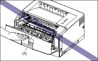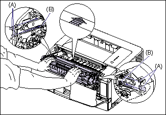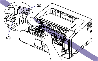 b. Do not touch the high-voltage contact (A) or the electrical contact (B) shown in the figure, as this may result in damage to the printer.