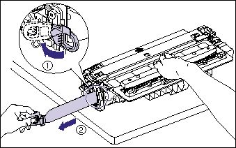 7. Place the toner cartridge on a flat surface, fold back the tab of the sealing tape (1), and then pull out the sealing tape (approx. 72 cm long) gently (2) while supporting the toner cartridge.