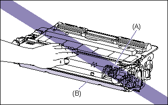 f. When pulling out the sealing tape, be careful not to touch the toner cartridge memory (A) or not to hold the drum protective shutter (B) with your hands.
