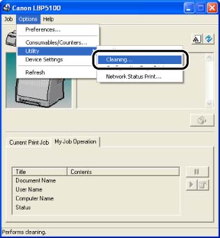 3. From the [Options] menu in the Printer Status Window, select [Utility] -> [Cleaning].