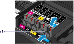 Push the tab (B) and lift the ink tank to remove.