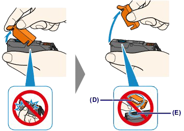 - Do not touch the inside of the orange protective cap (D) or the open ink port (E). The ink may stain your hands if you touch them.