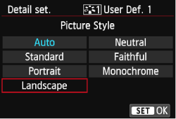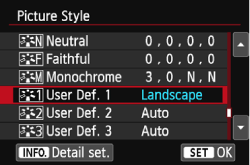 You can select a base Picture Style such as [Portrait] or [Landscape], adjust its parameters as desired and register it under [User Def. 1], [User Def. 2], or [User Def. 3].