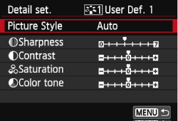 7. Press the <MENU> button to save the adjusted parameters. The Picture Style selection screen will reappear.