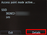 9. Press the OK button. When "Access point mode active" is displayed, the printer is properly set in the access point mode.