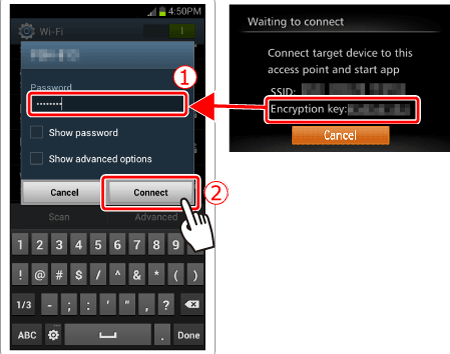 Enter the encryption key displayed on the camera screen into the password field on the smartphone, and then
