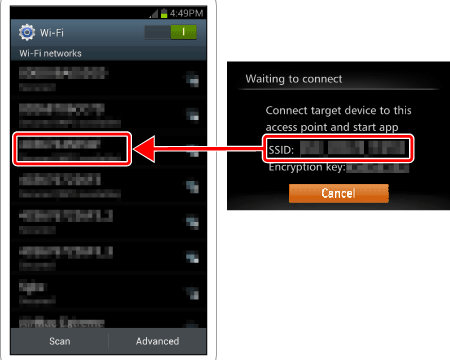 7. Choose the SSID (network name) displayed on the camera’s screen from the list of access points displayed on the Android™ smartphone.