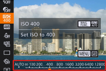 > button, choosing [ISO AUTO], choosing an option (either by pressing the <