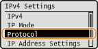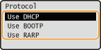 ].- You can use only one of the protocols DHCP, BOOTP, and RARP. If the selected protocol is set to <On>, the other two protocols are automatically set to <Off>.