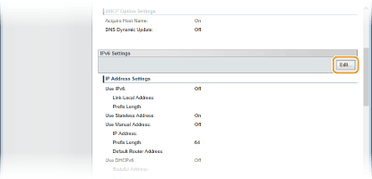 The IPv6 addresses of the machine can be configured via the Remote UI. Before setting IPv6 addresses, check the IPv4 address settings. You need to specify the correct IPv4 settings to use IPv6 addresses. The machine can use up to seven of the following IPv6 addresses.