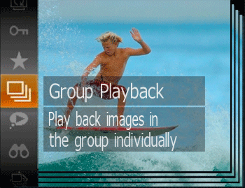 ) button. You can also browse through images quickly "Navigating through Images in an Index" and magnify them "Magnifying Images" . By choosing [All Images in Group] for "Protecting Images", "Erasing Multiple Images at Once", "Adding Images to the Print List (DPOF)" , or "Adding Images to a Photobook", all images in the group can be manipulated at once. - To ungroup images so that they are displayed only as single still images, press the <