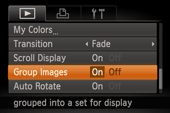 ), and then select [On] for [Group Images] in the [Playback Menu] (