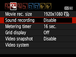 ] tab and set [Sound recording] to [Disable] to shoot movies without recording sound.