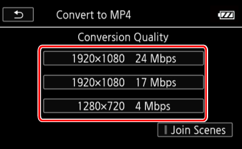 • Before selecting the video quality, touch [Join Scenes] to join the converted movies into a single scene.