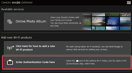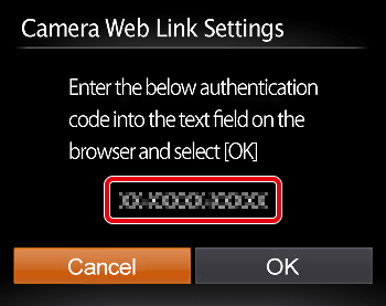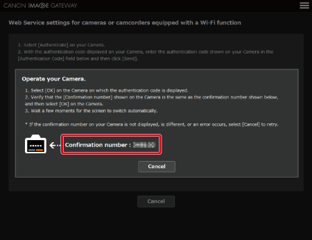 12. Once the camera is connected to CANON iMAGE GATEWAY via the access point, an authentication code is displayed.