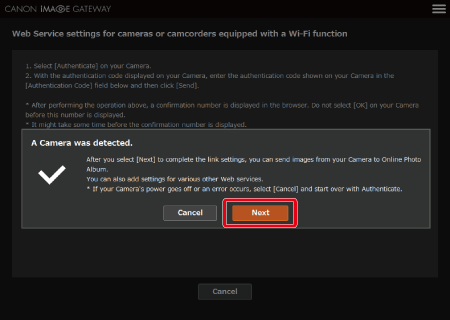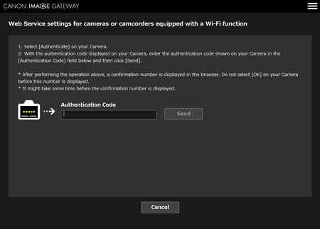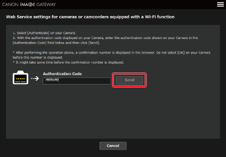 13. On the computer, enter the authentication code displayed on the camera and click [send].