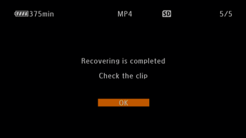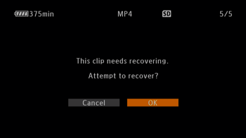 Some actions, such as suddenly turning off the camcorder or removing the recording media while data is being recorded, can cause data errors on the recording media. In such case, you may be able to recover the data if a message indicating that a clip (SD card) needs recovering. The message appears when you try to play back a corrupted MP4 clip from the [MP4] index screen.