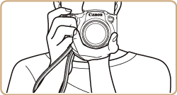 Keep your arms tight against your body while holding the camera firmly by the sides. Be sure that your fingers do not block the <flash>.