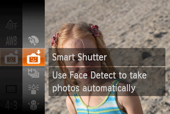 | Auto Shooting after Smile Detection | The camera shoots automatically after detecting a smile, even without you pressing the shutter button. | 1.After you select a shooting mode, the camera enters shooting standby mode, and [Smile Detection on] is displayed. 2. Aim the camera at a person. - Each time the camera detects a smile, it will shoot after the lamp lights up. - To pause smile detection, press the button. Press the button again to resume detection. |