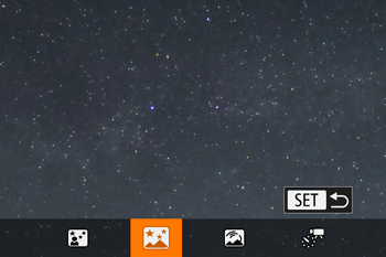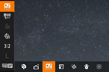 ] tab > [Star Emphasis] > [Sharp]. To emphasize the bright stars in a starry sky, set [Star Emphasis] to [Soft]. This setting can produce eye-catching shots by enlarging bright stars while de-emphasizing dimmer stars. To disable starlight processing, select [Off]. - Try switching to manual focus mode to more accurately specify the focal position before shooting.