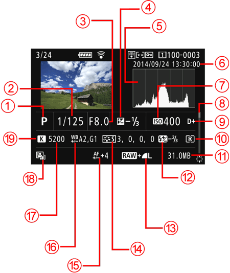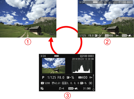 Detailed information <-> Lens / Histogram information <-> White balance information <-> Picture Style information <-> Color space / Noise reduction information <-> Lens aberration correction information <-> GPS information* <-> Detailed information