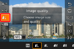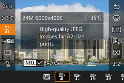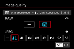 ] dial to change the [JPEG], selecting your preferred save resolution and compression ratio. Select [–], and the camera will only save the RAW file.