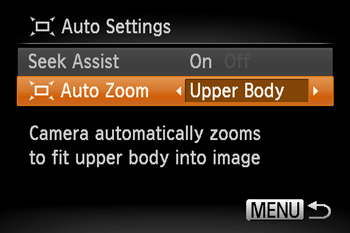 Auto Settings] -> [ Auto Zoom]. You can choose [Off] to deactivate this feature and use only the feature described in "Easily Reacquiring Subjects with Auto Zooming (Seek Assist)" in the camera’s instruction manual. - You can zoom in or out with the zoom lever when [Face], [Upper Body], or [Whole Body] is selected, but the original zoom factor will be restored in a few seconds after you release the lever.