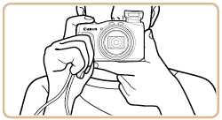 - When shooting, keep your arms close to your body and hold the camera securely to prevent it from moving. If you have raised the flash, do not rest your fingers on it.