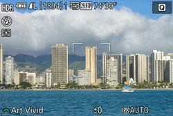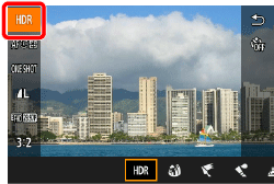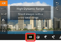 When the camera is set to HDR (High Dynamic Range) mode, three consecutive images are captured at different brightness levels each time you shoot, and the camera combines image areas with optimal brightness to create a single image. This mode can reduce the washed-out highlights and loss of detail in shadows that tends to occur in high-contrast shots.