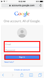 (2) At the following screen, enter your account information (Gmail address and password), and tap [ Sign in ].