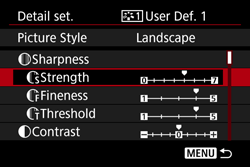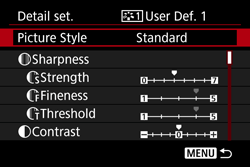 - Press the [ MENU ] button to register the modified Picture Style. The Picture Style selection screen will then reappear.