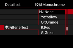 : Monochrome Adjustment ] Besides [Strength], [Fineness], or [Threshold] of [Sharpness] and [Contrast], you can also set [Filter effect] and [Toning effect].- With a [Filter effect] applied to a monochrome image, you can make white clouds or green trees stand out more.
