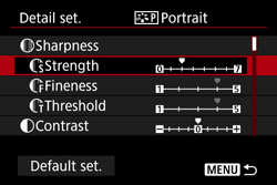 - By selecting [Default set.], you can revert the respective Picture Style to its default parameter settings.