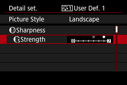 - If a Picture Style has already been registered under [User Def. *], changing the base Picture Style in step 6 will nullify the parameter settings of the registered Picture Style.