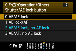2. Select the [Shutter/AE lock button (C.FnIV:Operation/Others No.7)], select [0:AF/AE lock].