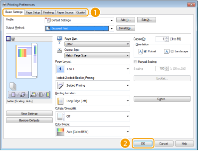 • Click the [Basic Settings], [Page Setup], [Finishing], [Paper Source], or [Quality] tabs to specify the print settings on each screen as necessary. For details, see the "e-Manual" (HTML manual) in the DVD-ROM supplied with the machine.