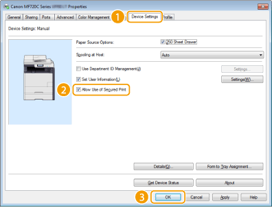 3. Click the [Device Settings] tab and make sure that the [Allow Use of Secured Print] check box is selected.
