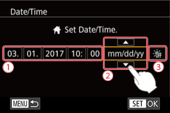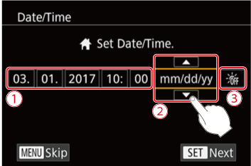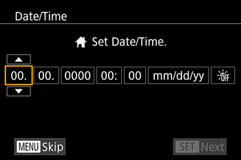 Set the current date and time correctly as follows if the [Date/Time] screen is displayed when you turn the camera on. Information you specify this way is recorded in image properties when you shoot, and it is used when you manage images by shooting date or print images showing the date.