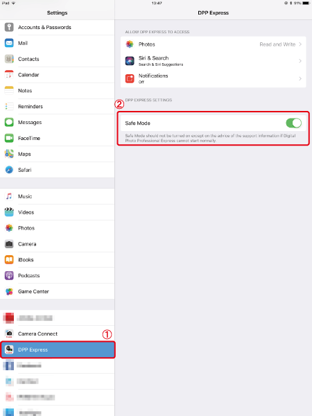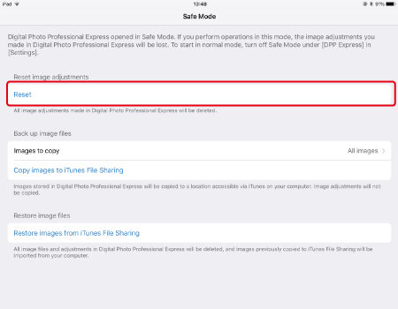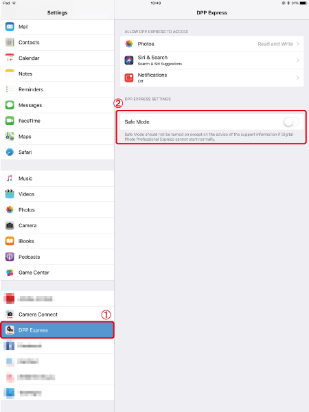 If Digital Photo Professional Express persists to operate abnormally even after restarting the iPad, follow the steps below to operate the application in safe mode.